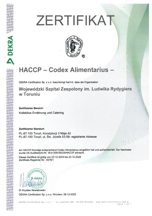 Treść certyfikatu: CERTYFIKAT AKREDYTACYJNY Potwierdza się spełnienie przez Wojewódzki Szpital Zespolony im. L. Rydygiera w Toruniu 000000002403, 87-100 Toruń, ul. św. Józefa 53-59 standardów akredytacyjnych dla leczenia szpitalnego w zakresie działalności WOJEWÓDZKIEGO SZPITALA ZESPOLONEGO oraz WOJEWÓDZKIEGO SZPITALA PSYCHIATRYCZNEGO CAŁODOBOWEGO Certyfikat nr: 2023/32 Certyfikat ważny 3 lata od daty wystawienia Minister Zdrowia z upoważnienia Ministra Zdrowia Waldemar Kraska Sekretarz Stanu (dokument podpisany elektronicznie) Data: 26 lipca 2023 r.